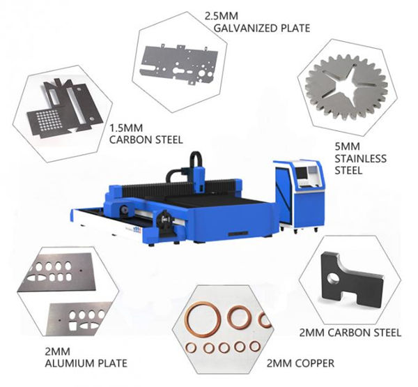 * Utilizzato specialmente per il taglio di acciaio al carbonio da 0,5-6 mm, acciaio inossidabile da 0,5 a 5 mm, acciaio zincato, lamiera d'acciaio zincata elettrolitica, acciaio al silicio e altri tipi di lamiere sottili.1000 W può tagliare alluminio da 3 mm e rame da 2 mm.